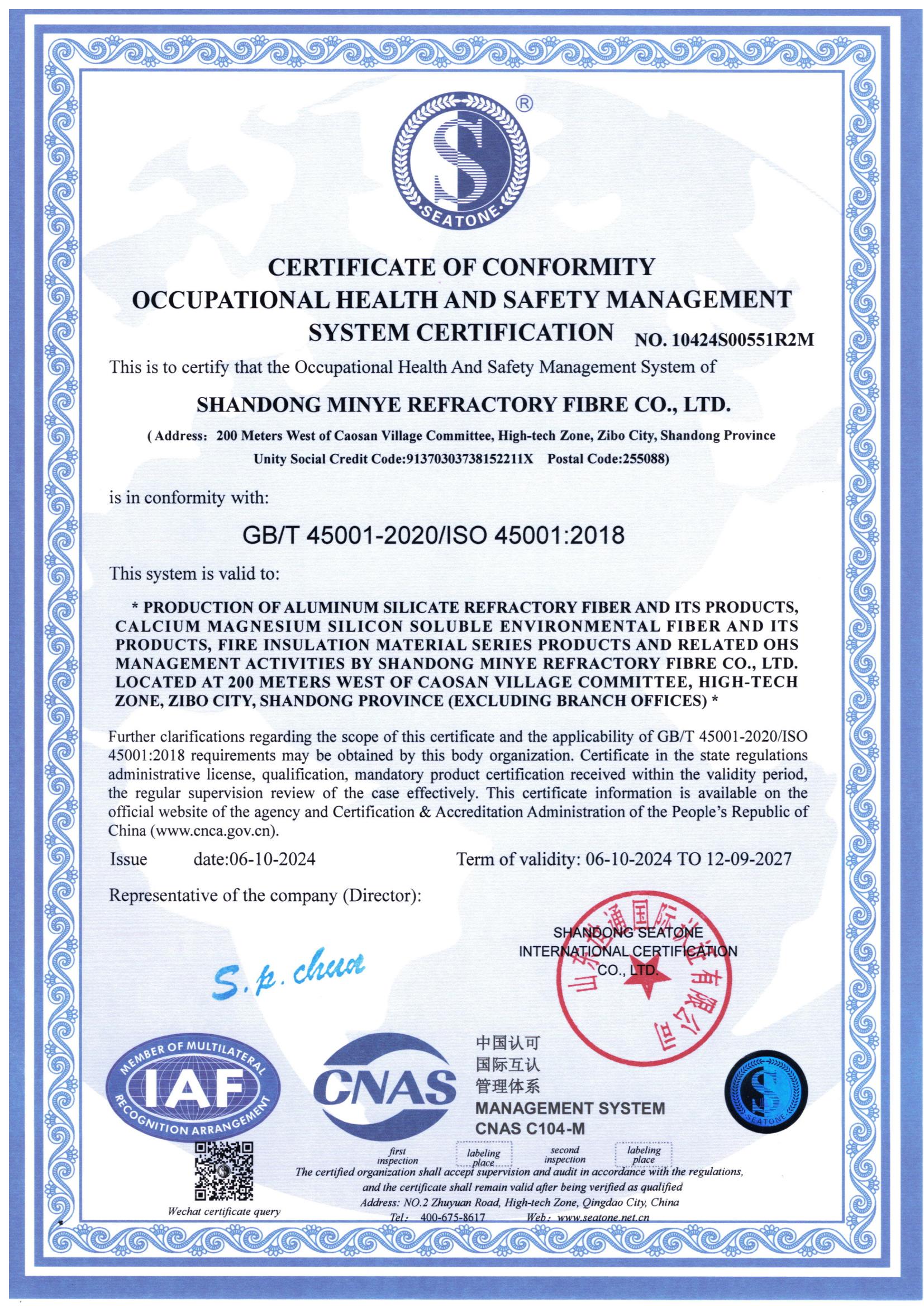 2024年職業(yè)健康體系認(rèn)證證書(shū)